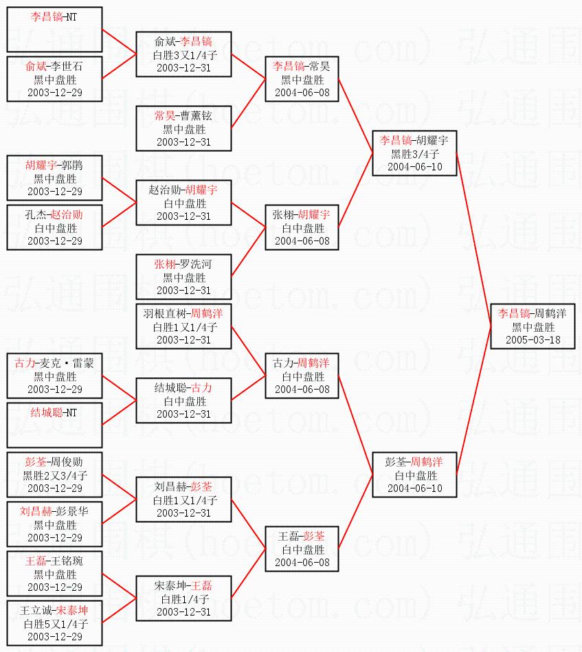 | 2.上半区半决赛李昌镐获胜, 比分:李昌镐 1:0 胡耀宇。棋局: | ||