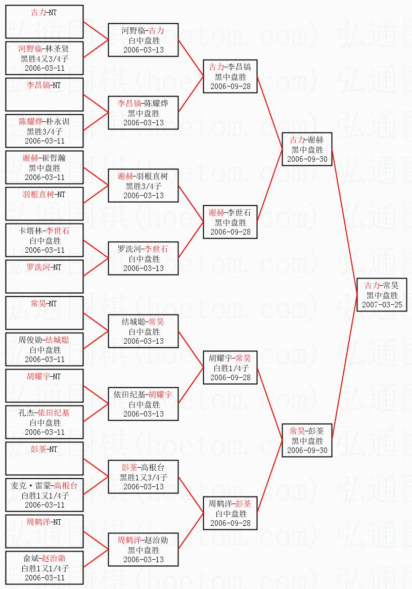 1.古力获得冠军,常昊获得亚军。决赛比分:古力2:0常昊。棋局: