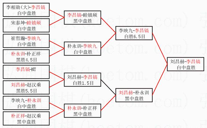 | 1.李昌镐获得冠军,刘昌赫获得亚军。决赛比分:李昌镐2:0刘昌赫。棋局: | ||