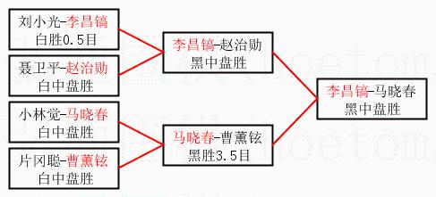 1.李昌镐获得冠军,马晓春获得亚军。决赛比分:李昌镐3:1马晓春。棋局:
