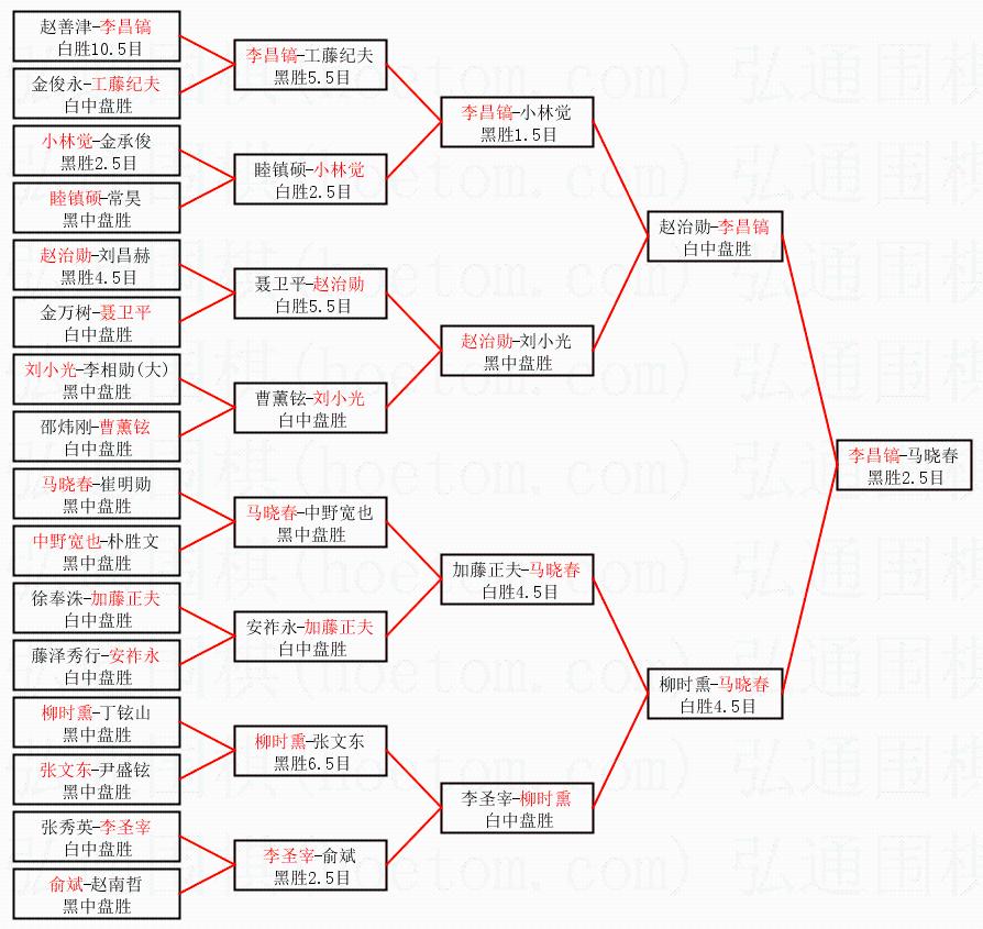 | 1.李昌镐获得冠军,马晓春获得亚军。决赛比分:李昌镐3:2马晓春。棋局: | ||