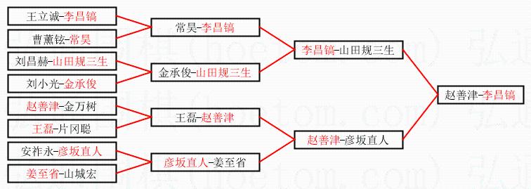 | 1.李昌镐获得冠军,赵善津获得亚军。决赛比分:李昌镐3:0赵善津。棋局: | ||