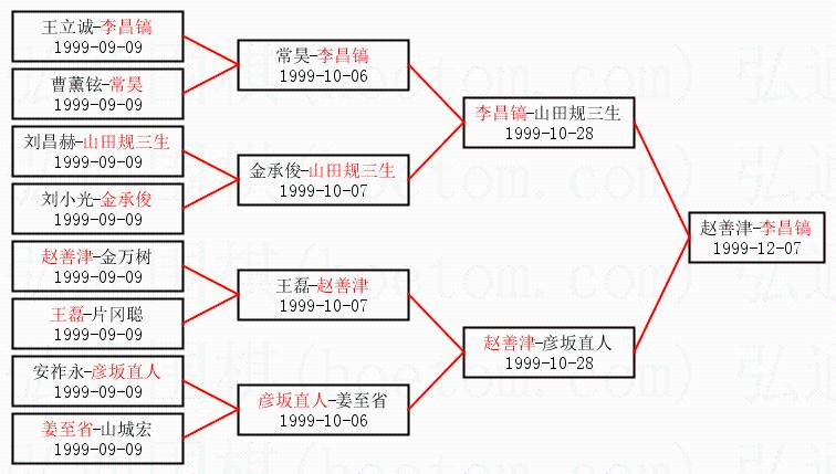 1.李昌镐获得冠军,赵善津获得亚军。决赛比分:李昌镐3:0赵善津。棋局: