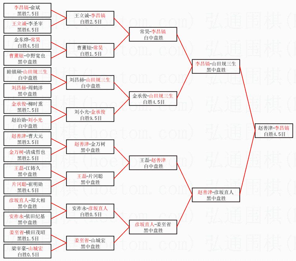 1.李昌镐获得冠军,赵善津获得亚军。决赛比分:李昌镐3:0赵善津。棋局: