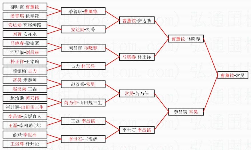 1.曹薰铉获得冠军,常昊获得亚军。决赛比分:曹薰铉2:1常昊。棋局: