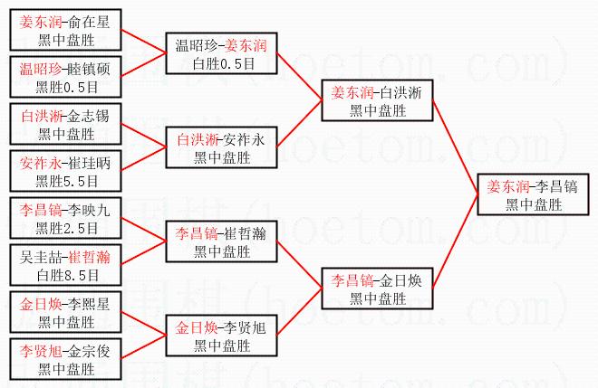 1.姜东润获得冠军,李昌镐获得亚军。决赛比分:姜东润2:1李昌镐。棋局: