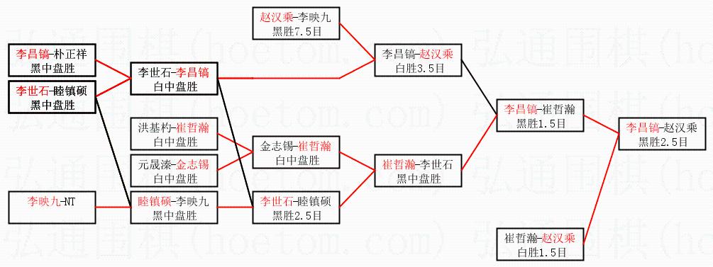 | 1.李昌镐获得冠军,赵汉乘获得亚军。决赛比分:李昌镐2:1赵汉乘。棋局: | ||