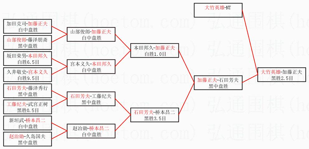 1.大竹英雄获得冠军,加藤正夫获得亚军。决赛比分:大竹英雄3:1加藤正夫。棋局: