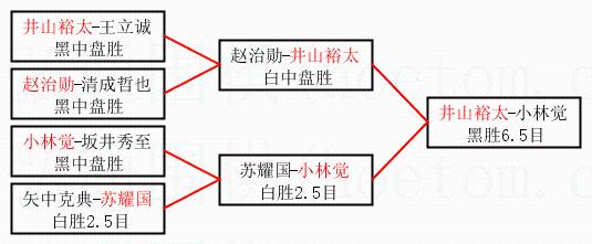 1.井山裕太获得冠军,小林觉获得亚军。决赛比分:井山裕太1:0小林觉。棋局: