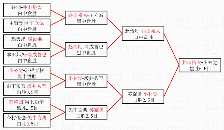 1.井山裕太获得冠军,小林觉获得亚军。决赛比分:井山裕太1:0小林觉。棋局: