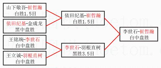 1.崔哲瀚获得冠军,李世石获得亚军。决赛比分:崔哲瀚1:0李世石。棋局: