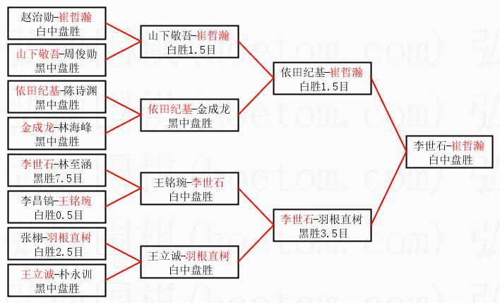 1.崔哲瀚获得冠军,李世石获得亚军。决赛比分:崔哲瀚1:0李世石。棋局: