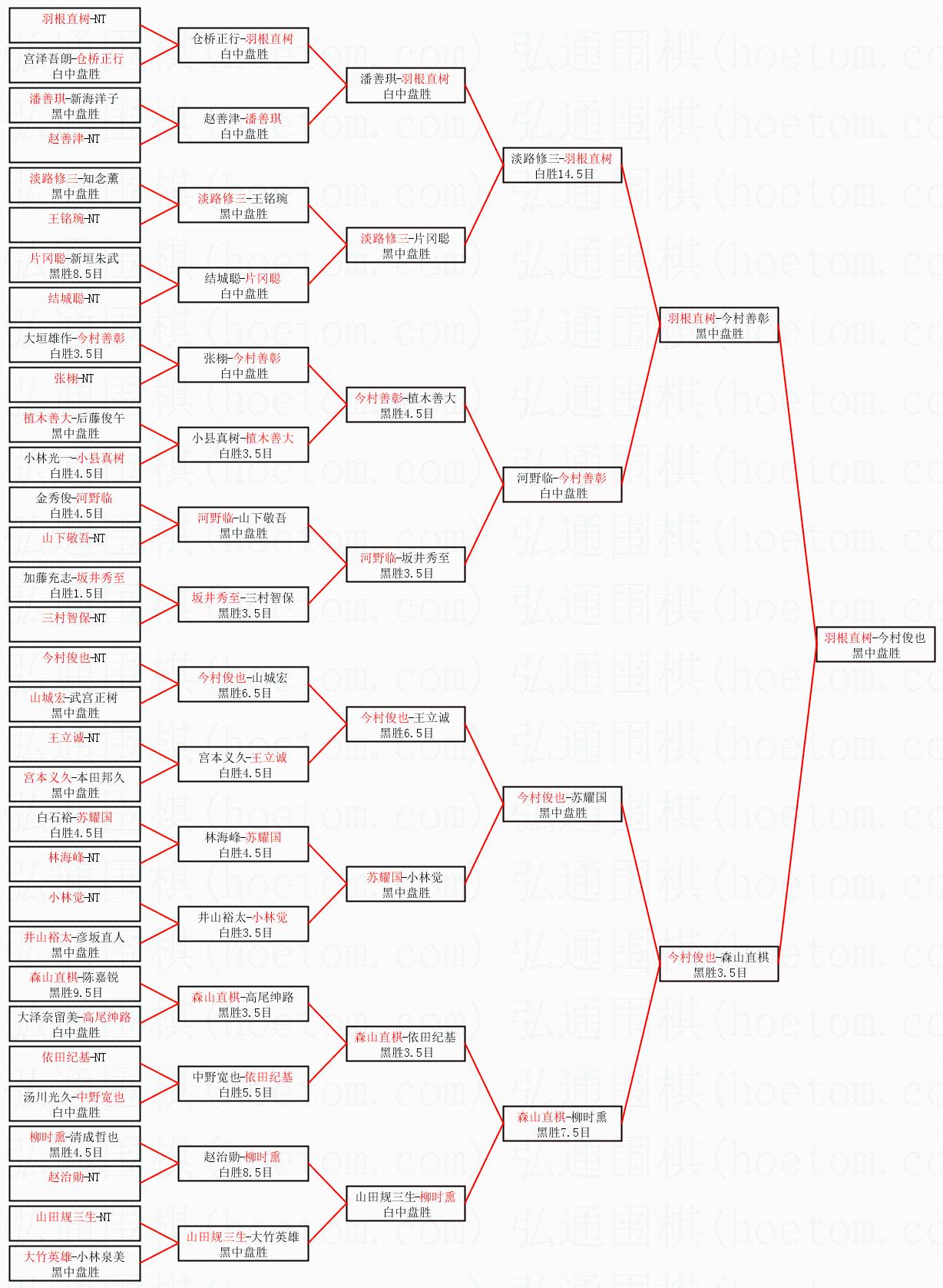 1.羽根直树获得冠军,今村俊也获得亚军。决赛比分:羽根直树1:0今村俊也。棋局: