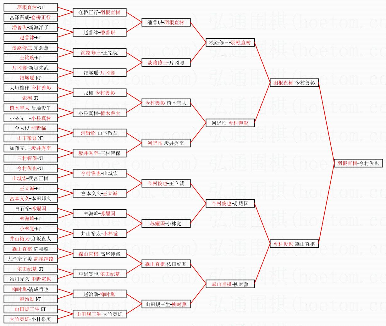 1.羽根直树获得冠军,今村俊也获得亚军。决赛比分:羽根直树1:0今村俊也。棋局: