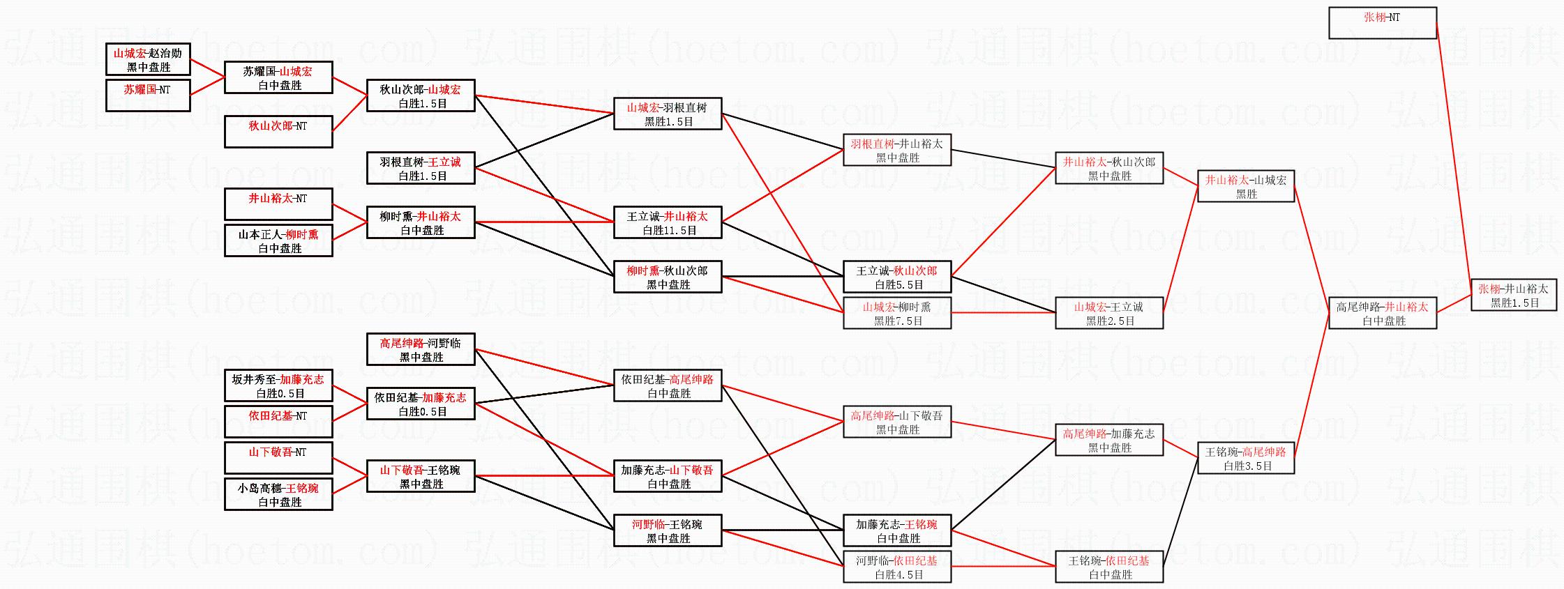 | 1.张栩获得冠军,井山裕太获得亚军。决赛比分:张栩4:2井山裕太。棋局: | ||