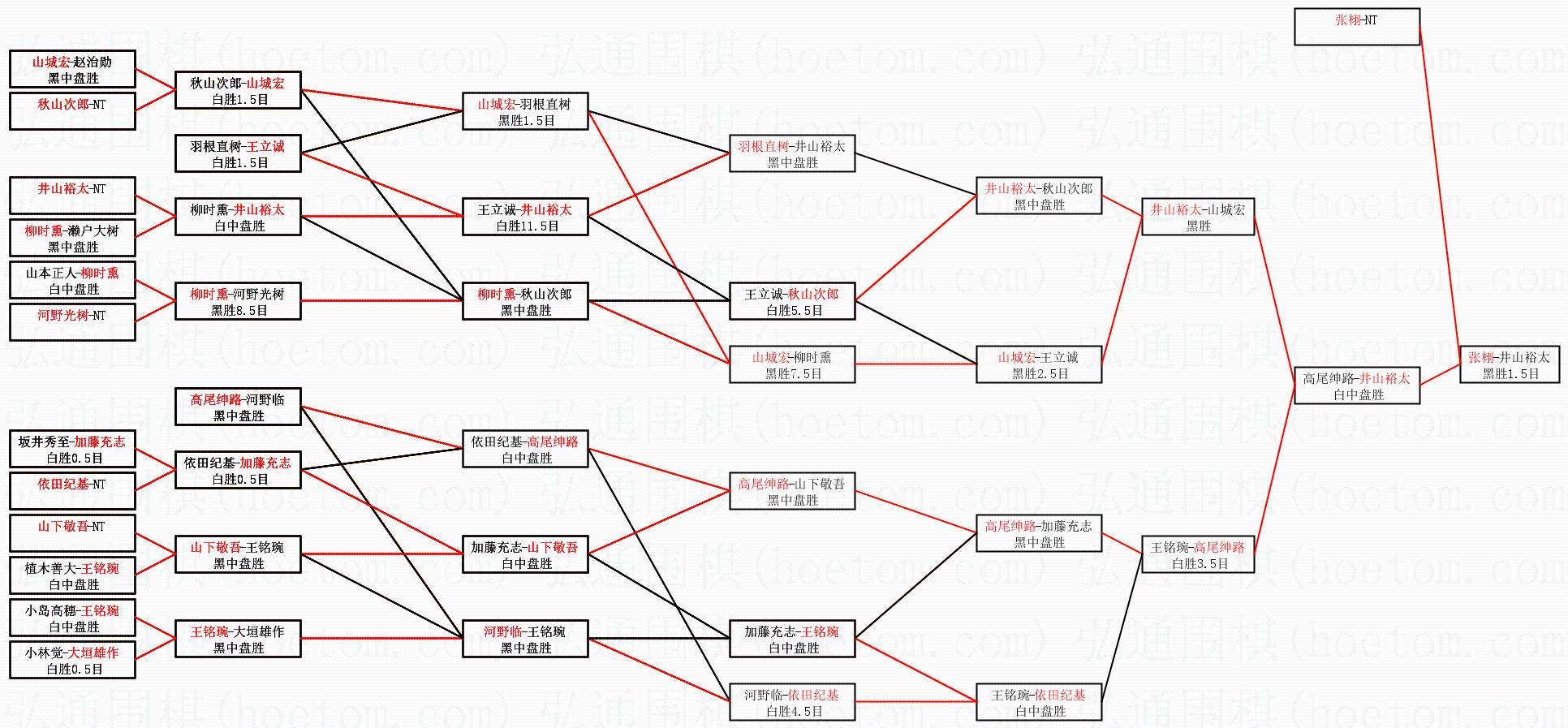 | 1.张栩获得冠军,井山裕太获得亚军。决赛比分:张栩4:2井山裕太。棋局: | ||