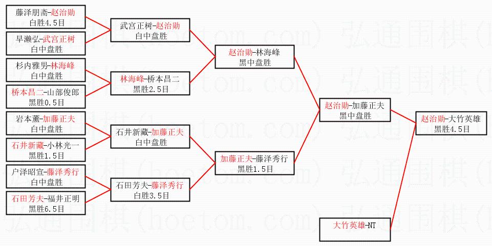 1.赵治勋获得冠军,大竹英雄获得亚军。决赛比分:赵治勋2:1大竹英雄。棋局: