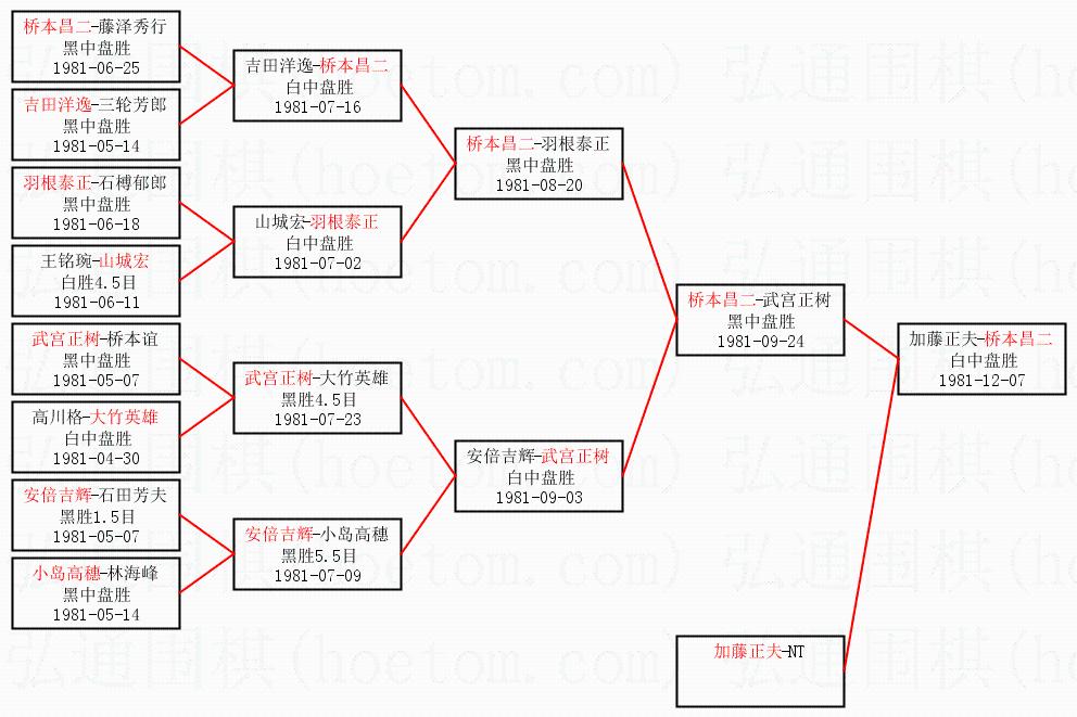 1.桥本昌二获得冠军,加藤正夫获得亚军。决赛比分:桥本昌二2:1加藤正夫。棋局: