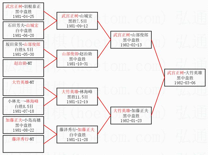 1.武宫正树获得冠军,大竹英雄获得亚军。决赛比分:武宫正树1:0大竹英雄。棋局: