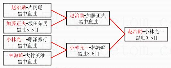2.上半区半决赛赵治勋获胜, 比分:赵治勋 1:0 加藤正夫。棋局: