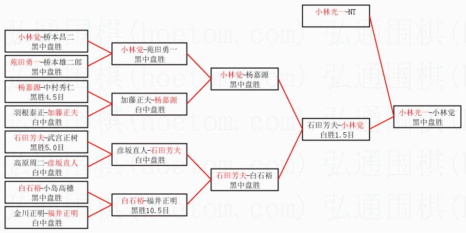 1.小林光一获得冠军,小林觉获得亚军。决赛比分:小林光一3:2小林觉。棋局: