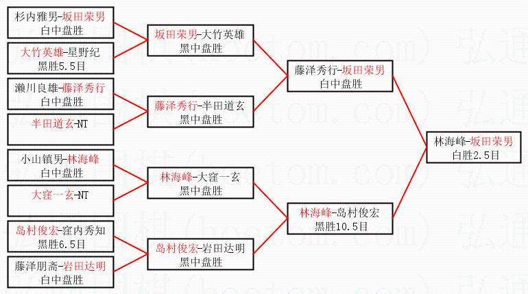| 1.坂田荣男获得冠军,林海峰获得亚军。决赛比分:坂田荣男2:1林海峰。棋局: | ||