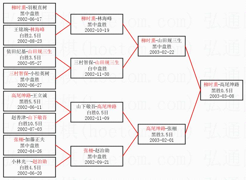 1.柳时熏获得冠军,高尾绅路获得亚军。决赛比分:柳时熏1:0高尾绅路。棋局: