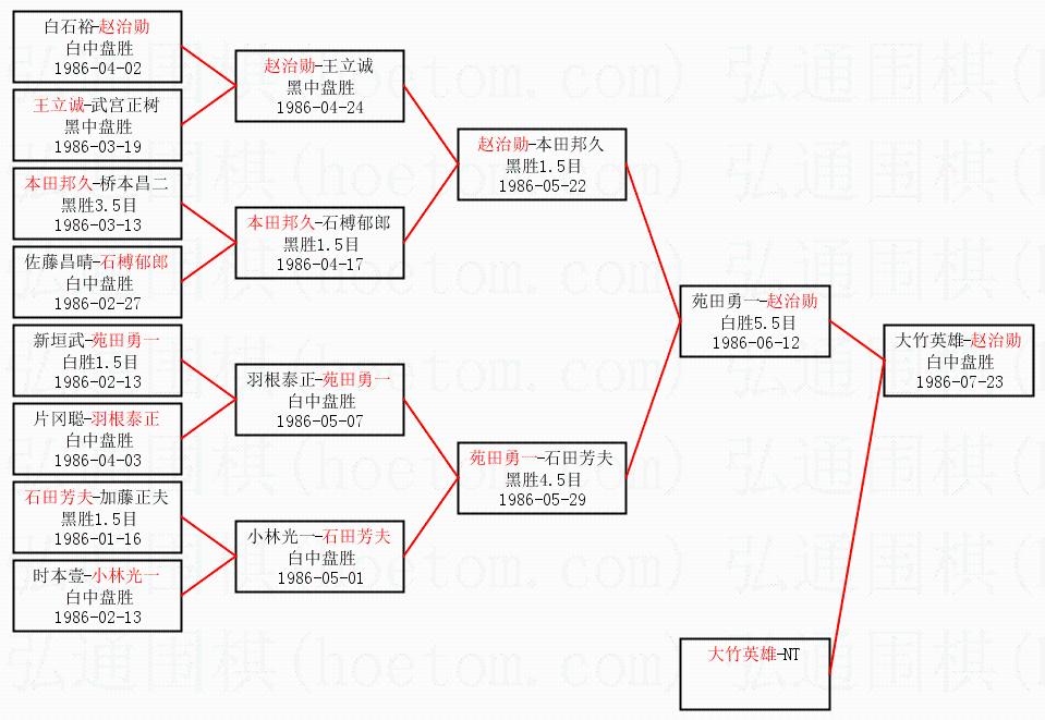 1.赵治勋获得冠军,大竹英雄获得亚军。决赛比分:赵治勋3:0大竹英雄。棋局: