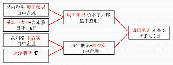 1.坂田荣男获得冠军,木谷实获得亚军。决赛比分:坂田荣男1:0木谷实。棋局:
