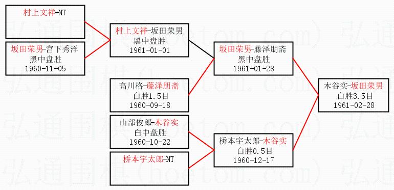 1.坂田荣男获得冠军,木谷实获得亚军。决赛比分:坂田荣男1:0木谷实。棋局: