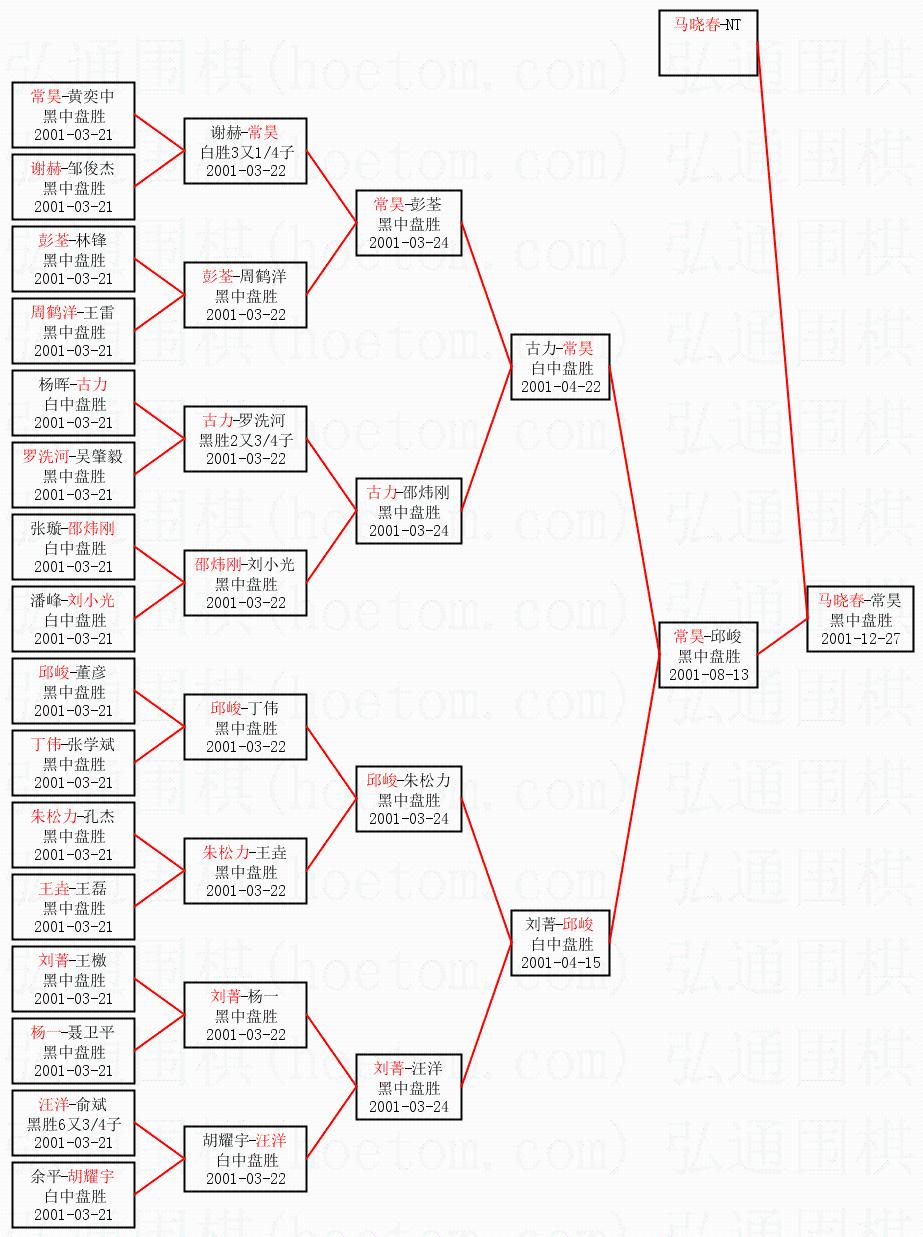 1.马晓春获得冠军,常昊获得亚军。决赛比分:马晓春3:2常昊。棋局: