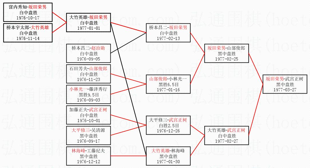 1.坂田荣男获得冠军,武宫正树获得亚军。决赛比分:坂田荣男1:0武宫正树。棋局: