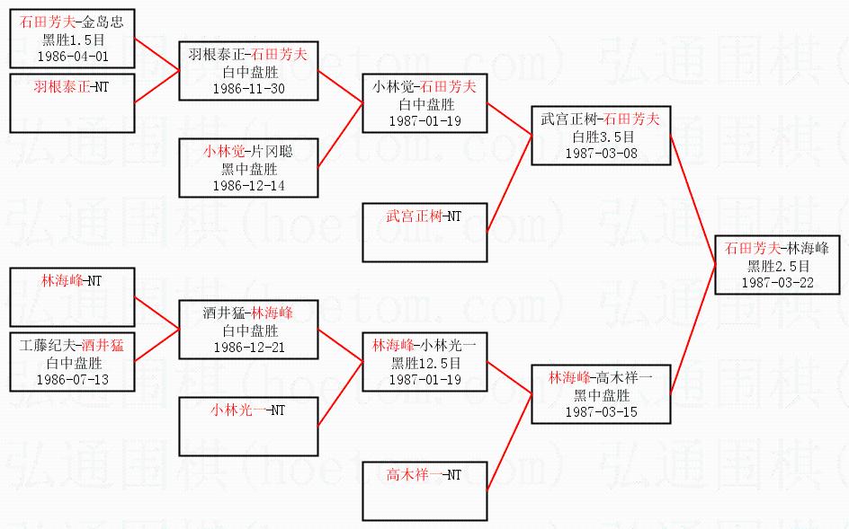 1.石田芳夫获得冠军,林海峰获得亚军。决赛比分:石田芳夫1:0林海峰。棋局: