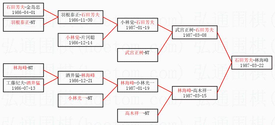 1.石田芳夫获得冠军,林海峰获得亚军。决赛比分:石田芳夫1:0林海峰。棋局: