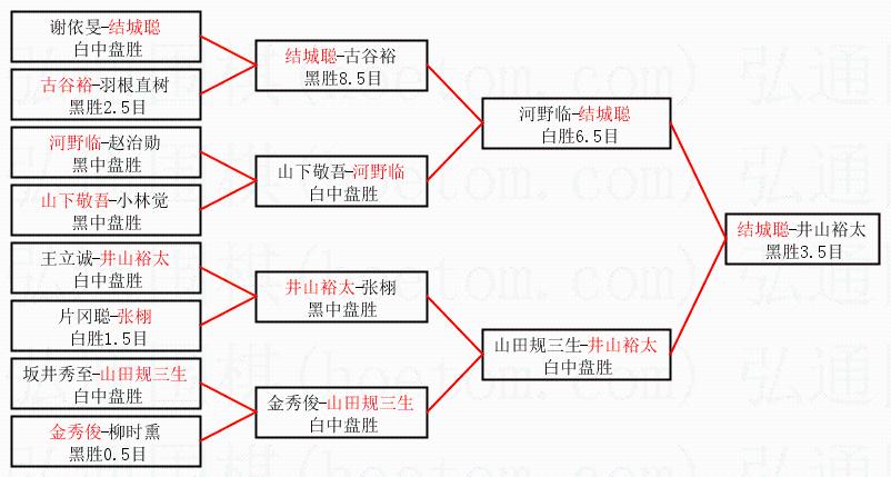1.结城聪获得冠军,井山裕太获得亚军。决赛比分:结城聪1:0井山裕太。棋局: