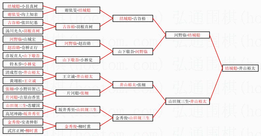 1.结城聪获得冠军,井山裕太获得亚军。决赛比分:结城聪1:0井山裕太。棋局: