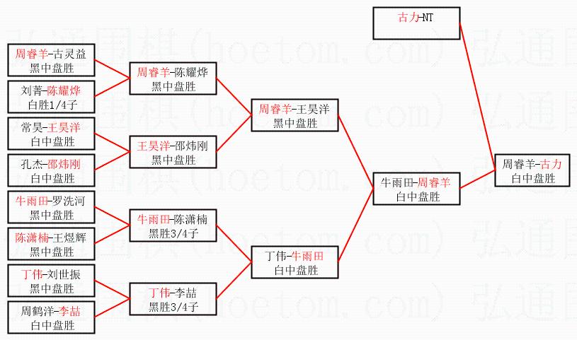 1.古力获得冠军,周睿羊获得亚军。决赛比分:古力3:0周睿羊。棋局: