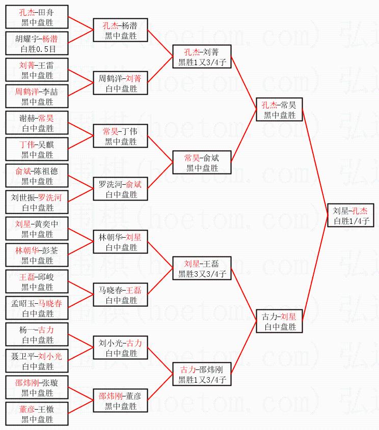 2.上半区半决赛孔杰获胜, 比分:孔杰 1:0 常昊。棋局: