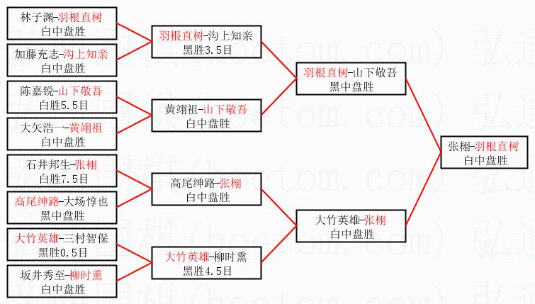 1.羽根直树获得冠军,张栩获得亚军。决赛比分:羽根直树1:0张栩。棋局: