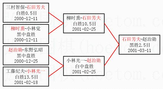 3.下半区半决赛赵治勋获胜,比分:赵治勋1:0小林光一。棋局:
