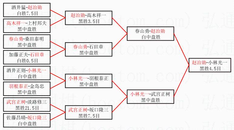2.上半区半决赛赵治勋获胜, 比分:赵治勋 1:0 春山勇。棋局: