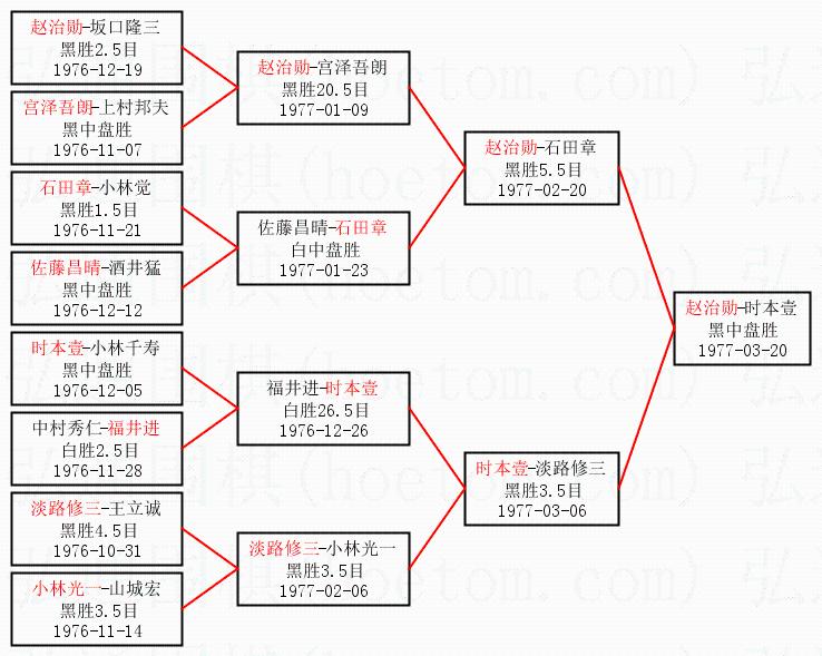 1.赵治勋获得冠军,时本壹获得亚军。决赛比分:赵治勋1:0时本壹。棋局: