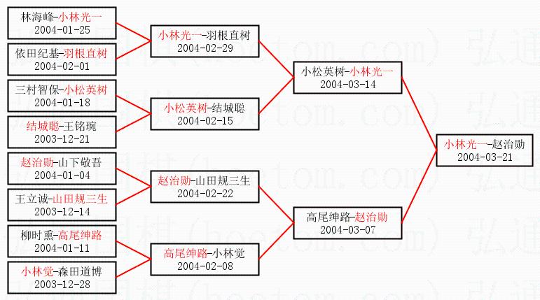 1.小林光一获得冠军,赵治勋获得亚军。决赛比分:小林光一1:0赵治勋。棋局: