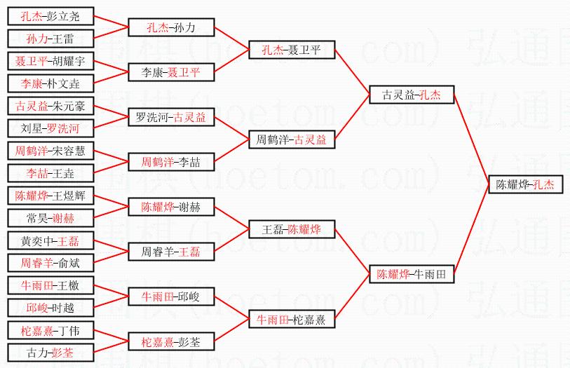 1.孔杰获得冠军,陈耀烨获得亚军。决赛比分:孔杰1:0陈耀烨。棋局: