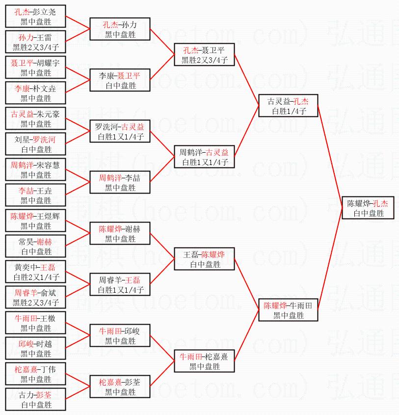 1.孔杰获得冠军,陈耀烨获得亚军。决赛比分:孔杰1:0陈耀烨。棋局: