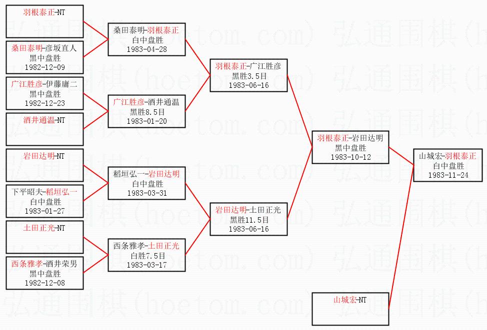 2.上半区半决赛羽根泰正获胜, 比分:羽根泰正 1:0 岩田达明。棋局: