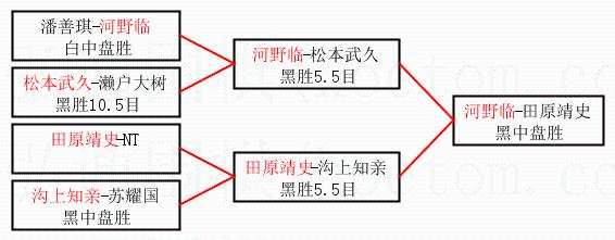 1.河野临获得冠军,田原靖史获得亚军。决赛比分:河野临1:0田原靖史。棋局: