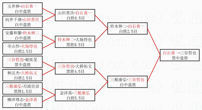 1.白石勇一获得冠军,三谷哲也获得亚军。决赛比分:白石勇一2:1三谷哲也。棋局: