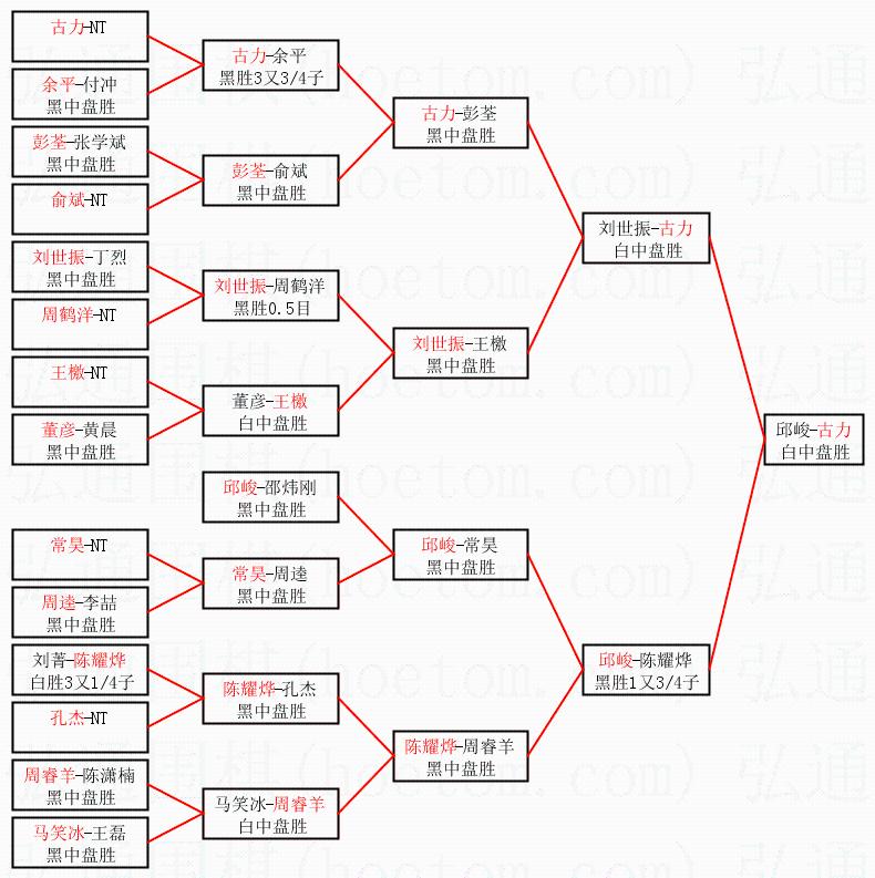 1.古力获得冠军,邱峻获得亚军。决赛比分:古力1:0邱峻。棋局: