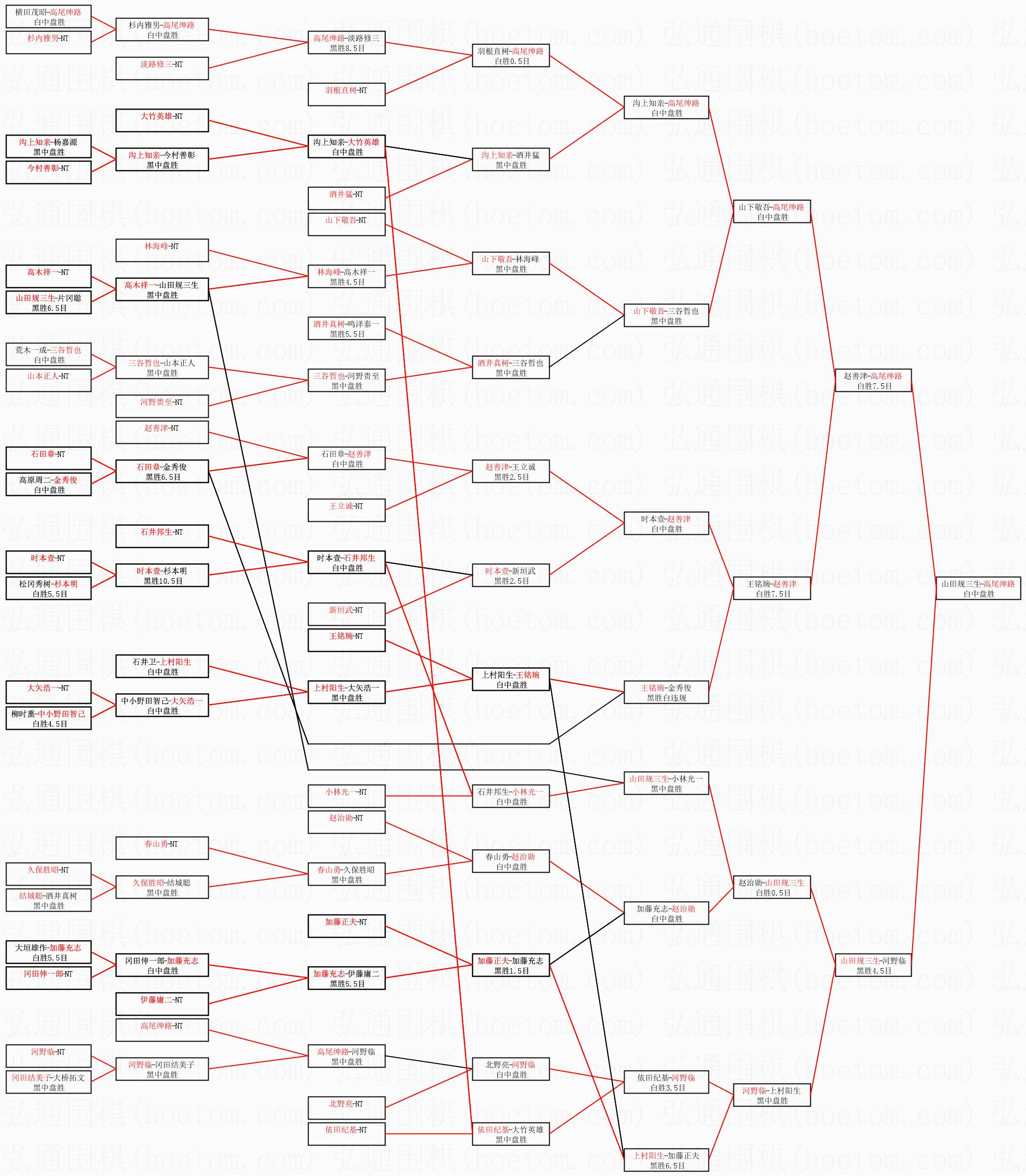 1.高尾绅路获得冠军,山田规三生获得亚军。决赛比分:高尾绅路1:0山田规三生。棋局: